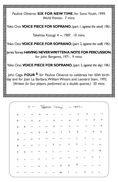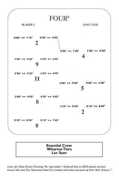 L: - "This is the last piece. It's written by John Cage. It's, uh, it's called Four6...F-O-U-R, a little 6 in the corner. And it's written for four players, it's the sixth one he wrote, I guess. And we're doing it as a double quartet tonight, it's half an hour long. Each player chooses twelve sounds that they use according to the score. Twelve specific sounds."