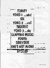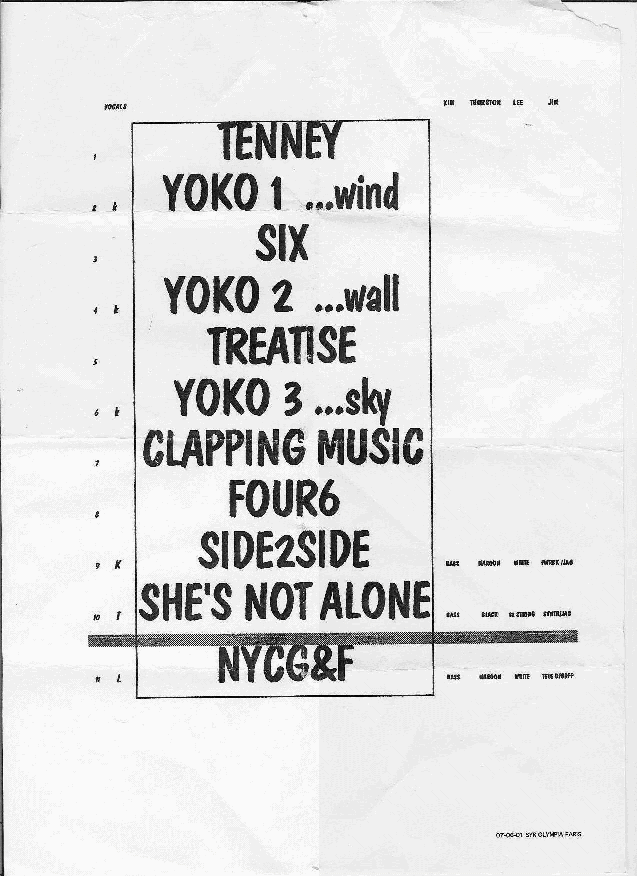 Percussion: Thurston, Kim, Lee, Jim on guitars, Steve on drums, William Winant on percussion. Scream: Kim - voice Six: TKLJ - gtrs / S - drums / WW - percussion Scream: Kim (on Thurston's back!) - voice Treatise: TKL - gtrs / J - electronix / S - drums / WW - percussion Scream: Kim - voice Clapping Music: S + W - clapping hands Four6: TKLJ - gtrs / S - drums / W - percussion / Christian Fennesz - laptop