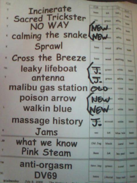 Incinerate Sacred Trickster No Way Calming the Snake The Sprawl 'Cross the Breeze Leaky Lifeboat Antenna Malibu Gas Station Poison Arrow Walkin Blue Massage the History Jams Run Free -- What We Know Pink Steam -- Anti-Orgasm Death Valley '69 |