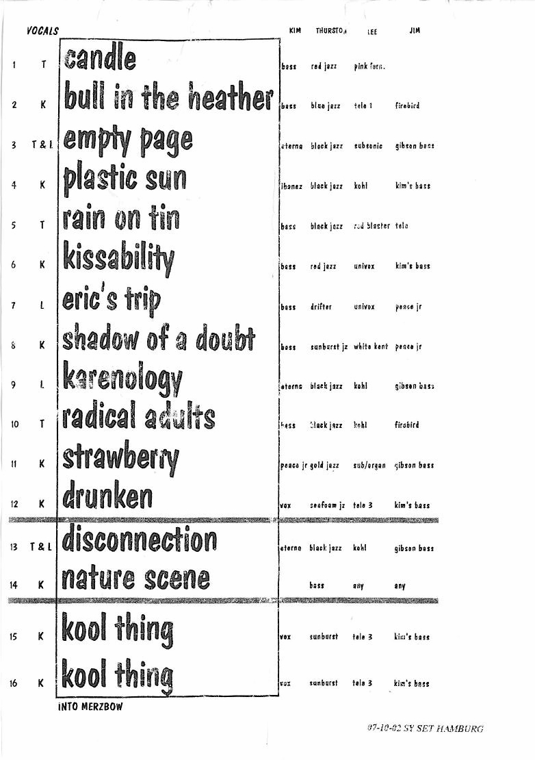 Candle Bull in the Heather The Empty Page Plastic Sun Rain on Tin Kissability Eric's Trip Shadow of a Doubt Karenology Radical Adults Lick Godhead Style Sympathy for the Strawberry Drunken Butterfly -- Disconnection Notice Making the Nature Scene -- Kool Thing Kool Thing (Merzbow) |
