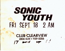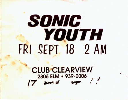 Randy Zimmerman clarifies: "I can’t confirm the date but I was at this show. It definitely wasn’t announced at the last minute because I recall buying tickets well in advance and a friend flew in from out-of-town to attend. It was an ‘all ages’ show so it had to be held after Club Clearview closed for the night (at 2:00 AM). So they emptied the club at 2:00 AM and then let ticketholders back in. There was no opening band. Sonic Youth didn’t start playing until after 3:00 AM. It was very loud. They closed with an extended and very noisy ‘Expressway To Yr Skull’. I remember walking out of the building around 5:30 AM with my ears ringing. It was a great show!"