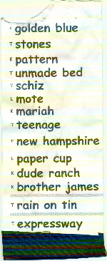 I Love You Golden Blue Stones Pattern Recognition Unmade Bed Schizophrenia Mote Mariah Carey & the Arthur Doyle Handcream Teenage Riot New Hampshire Paper Cup Exit Dude Ranch Nurse Brother James -- Rain on Tin -- Expressway |