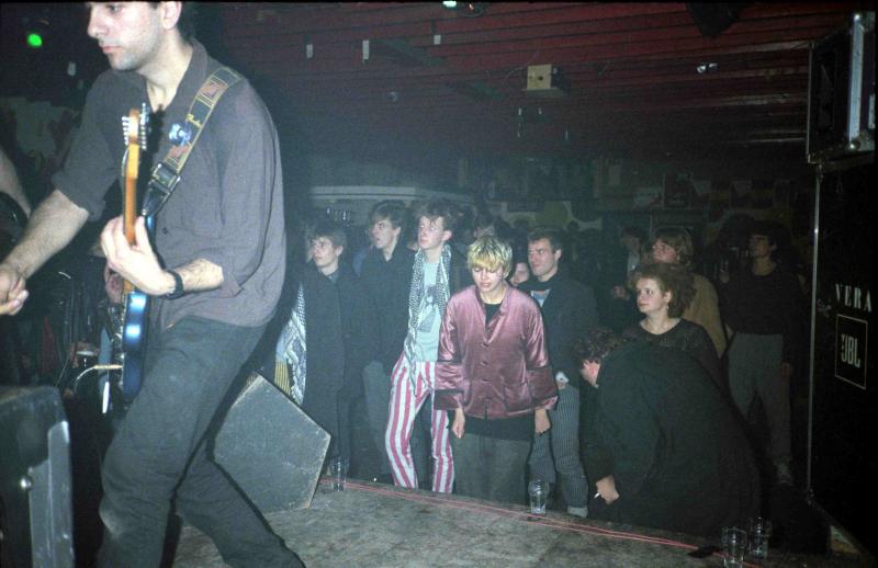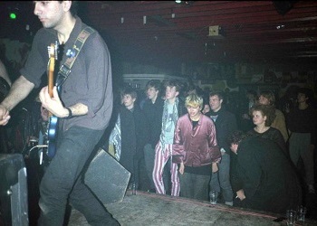 T: "Yo! We're gonna do a song...[coughs]. This mic stand is fucked! Hey, buy this record by Vacuum! We're gonna do a song, this is for...hey what's this group called Rebel Yell? You want that back? We gotta tune up, you gotta wait. Hey John, you see what's happening up here?"