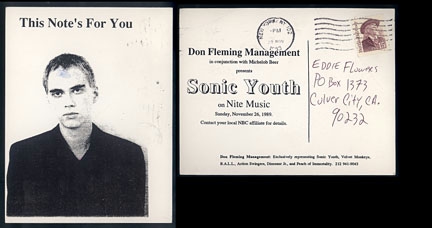 Night Music was a syndicated American late night show featuring a variety of lesser known, more experimental acts. This was Sonic Youth's first television appearance. If you weren't lucky enough to see it air in 1989, it was immortalized on the Screaming Fields of Sonic Love VHS release in 1995. The date was long debated until a very helpful postcard from "manager" Don Fleming (who joins the band on keyboards for "Silver Rocket") turned up, however I'm still not sure if this show aired live or was pre-taped at an earlier date. Any idea?