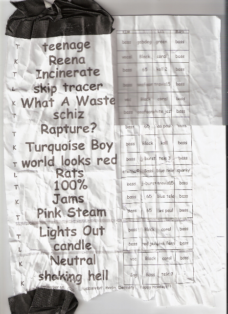 Teenage Riot Reena Incinerate Skip Tracer What a Waste Schizophrenia Do You Believe in Rapture? Turquoise Boy World Looks Red Rats 100% Jams Run Free Pink Steam -- Lights Out Candle -- The Neutral Shaking Hell -- Kool Thing |