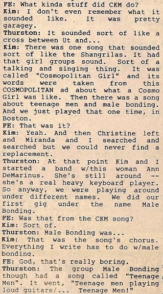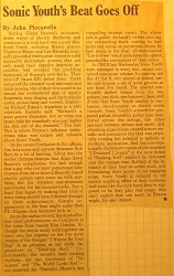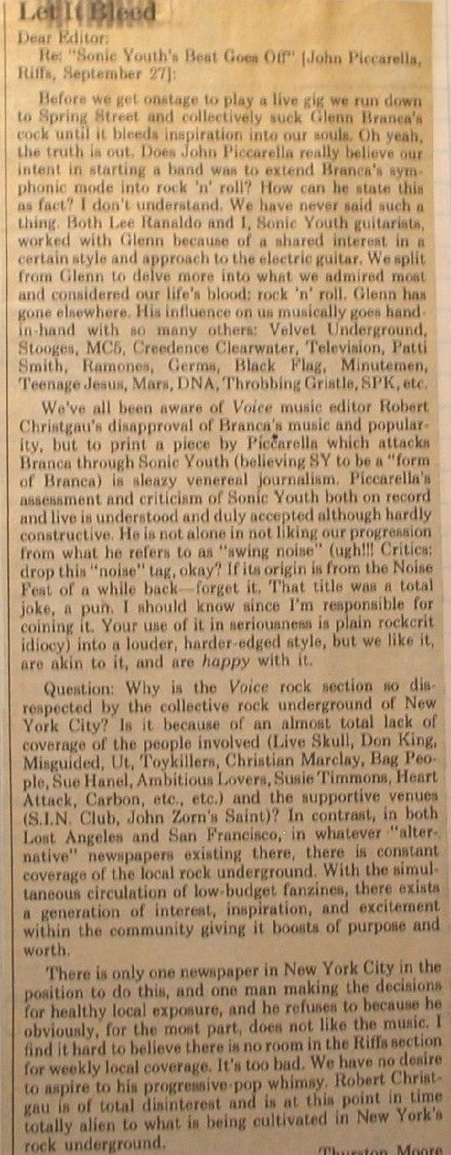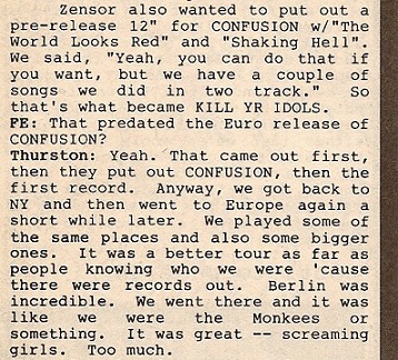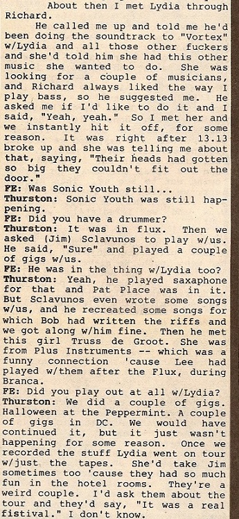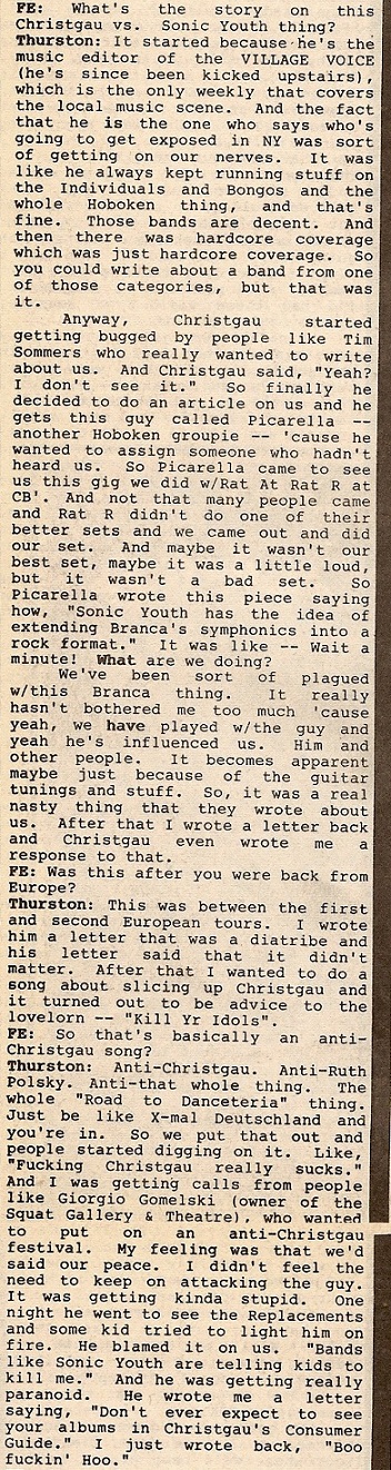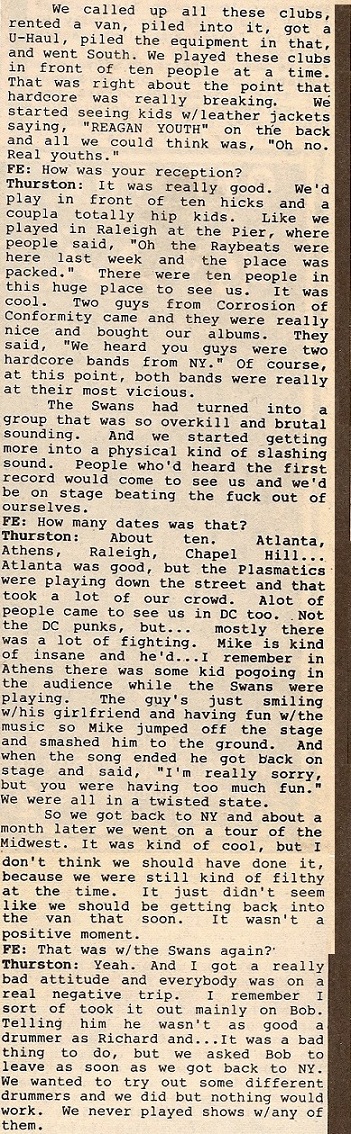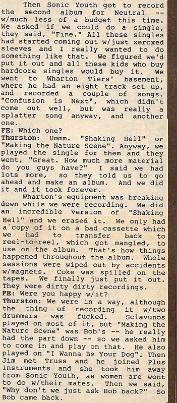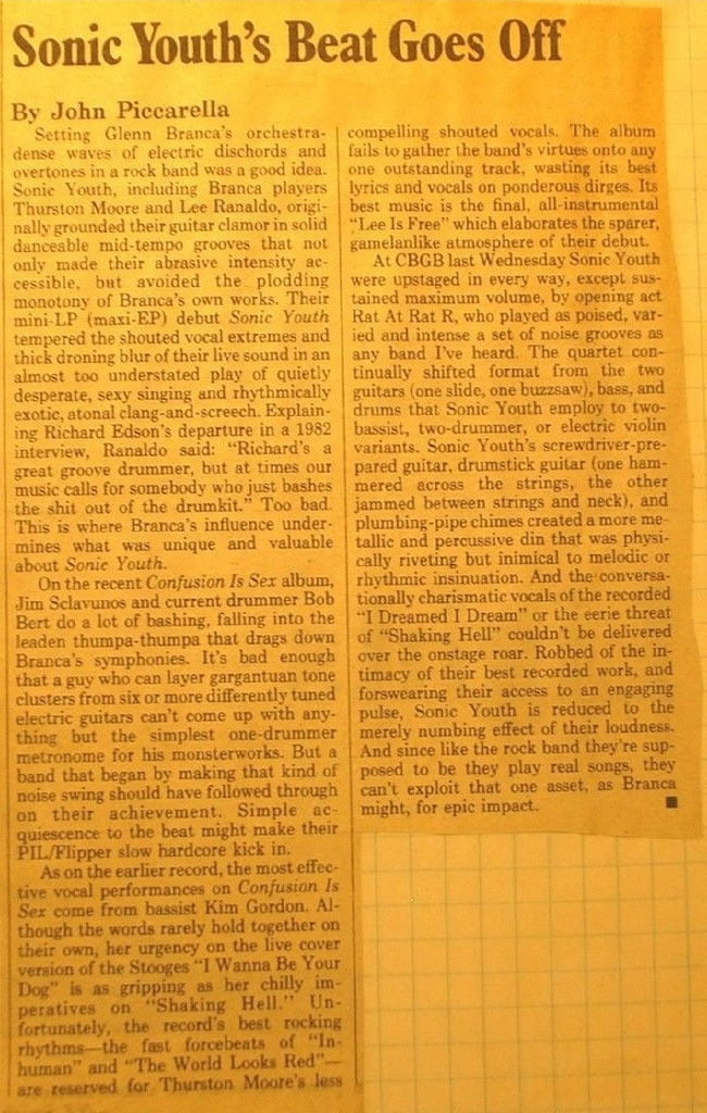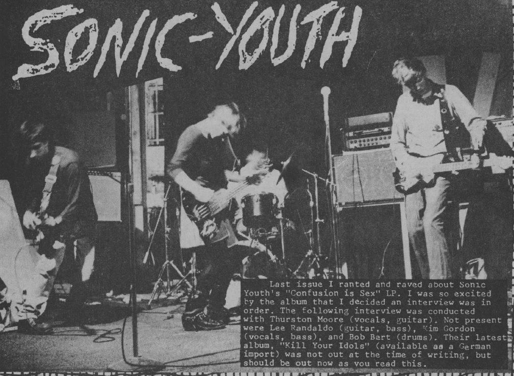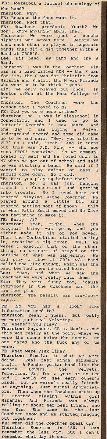 Perhaps the most exciting find comes courtesy of Raj Paden, who sent me another 1983 article from Terminal! issue 14, which you can find on archive.org. It's a great interview with Thurston, Lee, and Kim and actually clarifies a couple of mysteries, including why "She's in a Bad Mood" is tagged "version" on the Confusion is Sex label. It sounds like the interview was done in summer 1983 when the band had come back from their first European tour. It was conducted around a CBGB performance, which is also reviewed with partial set list data - possibly July 16th or September 14th, or another undocumented date. It suggests that both Kim and Lee take turns on vocals, which is curious since aside from his "Freedom!" support in "Confusion is Next", there isn't really a Lee vocal in this era...except for "Blooze Blurrr". Huge thanks to Raj for informing me about this, and please send me any cool old SY interviews you might find buried on the internet!