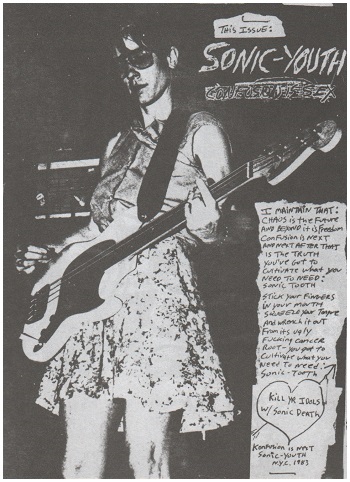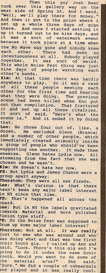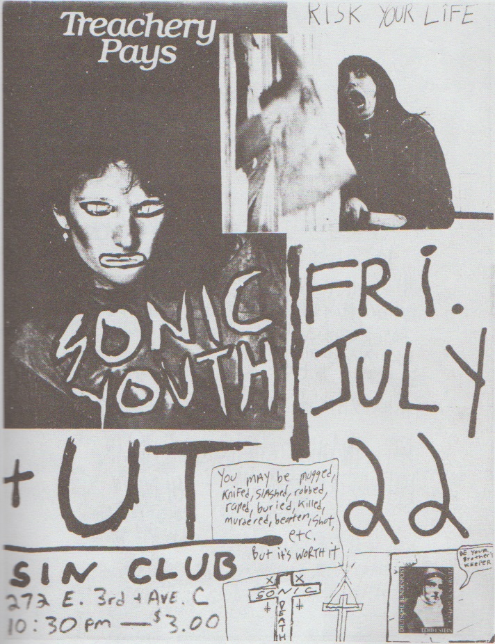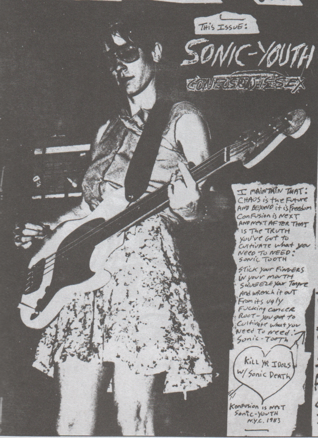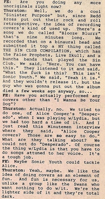 | Asking the important questions! This confirms that the only cover they played in this era was "I Wanna Be Yr Dog", which solidifies my theory for that pic with Mike Gira on bass. And of course, Sonic Youth would go on to cover two Alice Cooper songs, "Hallowed Be Thy Name" and "Is It My Body". As for "Sinister Purpose" (originally by Creedence Clearwater Revival), it appears on an '84 set list along with "Straight Edge" and "Rise Above", which are also discussed in this Forced Exposure interview (sorry though, my cut off date is 1983!). Lee throws a quick tease of the main riff in during the November 8th Milan show. Anyway, the real meat of this discussion is "Blooze Blurrr". What the hell is "Blooze Blurrr"? When I was first starting the Concert Chronology, the August 11th, 1985 Chicago show was a very popular bootleg known as Anarchy at St Mary's Place (long before the band released the entire show themselves). One of the most curious parts of the set was an instrumental that led into "Brother James". I asked the band very early on what the title of this song was (unaware that it had been released on a Bang Zoom compilation, though untitled). The first suggestion was "Blooze Blurrr", which I'd obviously never heard of. There seemed to be some recollection that it was in the GDD# tuning, which this unknown Chicago instrumental was. Of course, time would tell that the Chicago tune was "Kat N Hat", a song they played from July-August 1985 and abandoned. Some versions even had Lee working on a vocal, though unfortunately not Chicago. But that left another question: what the the heck was "Blooze Blurrr"...? This description from Thurston is the only time I've seen the song mentioned in an interview. I'm not sure why he brings it up when asked about "unoriginal" songs, but based on the response by the Sin Club compilation folks, maybe it was more of a bluesy, not-Sonic Youthy thing. They recorded it on a "binaural head" - is he referring to the 2-track session at Wharton's, or some other session entirely? I started a thread on the song on the SY "gossip" board, pooling the information I had at the time (2009). I bumped it a few years later, which prompted this very enlightening response from Lee Ranaldo: "Haven't heard the instrumental track in question-in an airport right now-but Blooze Blurr did exist as it's own song-as w Kat'n'Hat it's an early attempt at vocals on my part, but we never developed it further. The song was fr Kill Yr Idols period-in fact I'm pretty sure we have 4-track recordings of the KYI stuff including BB somewhere in the archive...." Aha! Confirmation that it was a Lee vocal, from the same era (if not session?) that produced the Kill Yr Idols material. Maybe they only did a 4-track demo but not a proper 2-track master (...) I'm guessing the weird instrumental that was tacked on to the Folk City mp3 set is a red herring, but you never know. Are they playing "Blooze Blurrr" in those September 10th Sin Club photos with Lee at the microphone? It's all part of the history and mystery of early Sonic Youth. Hey, another song they mention in the Forced Exposure interview, just in passing, is "Mildred Pierce"! Yes, that "Mildred Pierce" - it was one of their earliest songs, written in standard tuning, and probably never recorded. Years later, Dave Markey would do a one-off hardcore cover band with Thurston, and Thurston suggested they resurrect "Mildred Pierce", which led to its revival within Sonic Youth. They did a long demo version (titled "Blow Job?") and then a proper 2-minute take on the album itself. Unfortunately, no recordings circulate of an early 80s "Mildred Pierce". They mostly stopped writing in standard tuning by late 1982, so it could be a really early song. Oddly, Thurston refers to its "commercial potential" in the interview.