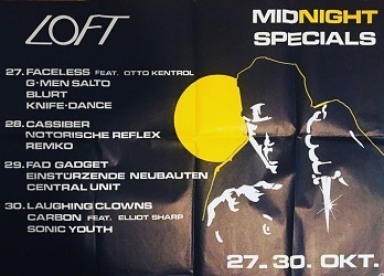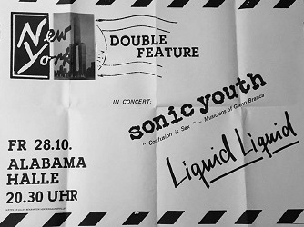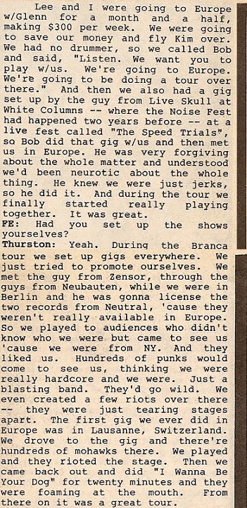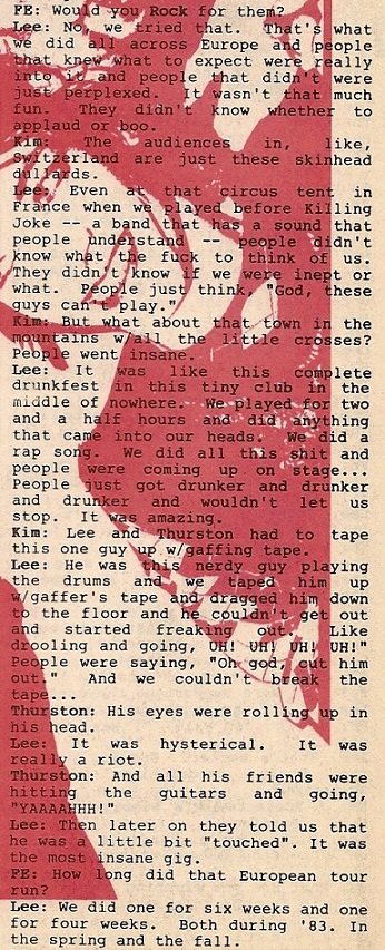 | This was earlier in the interview, but it refers to one of the most fascinating, mythical gigs from the European Confusion tours. I was able to confirm with Bob Bert that this show took place in Dorfen, aka Schwindkirchen. A tape of this October 29th gig actually circulates, but unfortunately it captures none of the fun. However...and this is where I have failed you all as a historian...years ago I was contacted by a guy named Andy who taped this show. The whole damn thing. While the recording I have cuts during "The Good and the Bad", he was able to confirm "Nature Scene" followed by an encore of "The Burning Spear" and "I Wanna Be Yr Dog", dissolving into a series of jams and improvisations with members of the audience. In fact, one of these audience members, a fellow named Reinhard Eggersdorfer, even contacted me to let me know that he played bass on "I Wanna Be Yr Dog" and the subsequent mess! Lee wrote extensively about this show in his tour diary, which reveals that their driver Christof joined on bass at some point, for something called "I Can't Stop It" - possibly the rumored improvised rap song, possibly another jam. I would love to hear the rest of this show and unfortunately I've been out of touch with Andy for a long time, and his e-mail is no longer valid. If you're out there, please get in touch with me! Or, if anyone out there happens to have a complete recording of this show, let me know! That rap jam could be the answer to all of life's mysteries. By the way, the band's "best" set order for this tour was as follows: