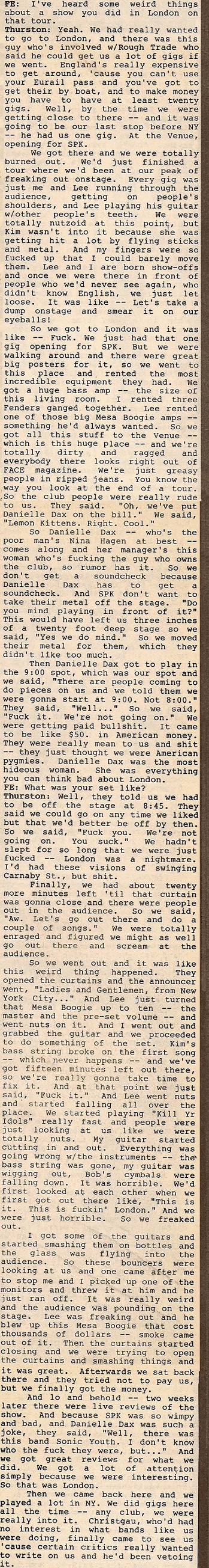 | The band's second European tour began in Munich, Germany on October 28th and ended with this infamous London gig on December 1st. Many, many recordings are available, though I suspect I'm missing a number of dates (or possibly not - Lee's journals revealed only two unlisted shows). At this point, the band was playing all three songs from Kill Yr Idols (often opening with the gorgeous wonder of "Early American", which eventually segued into "Burning Spear" via the Scream tape). They were still playing most of the Confusion material, and heavily favoring "The Burning Spear" off the first record (with occasional epic deliveries of "The Good and the Bad" and very rarely "I Don't Want to Push It"). They alternated between opening with "Early American" and "The World Looks Red", usually working towards ending the set with Thurston on bass. A tape of the Munich gig reveals some post-show chatter with the band who seem discouraged by the opening night. They certainly hit their groove early on - most shows on this tour are very exciting to listen to. While many shows were recorded, some even saw semi-official release. Most notable is the November 27th gig in Venlo, Holland which was released in its entirety via Sonic Death in the mid 90s. Though early reports suggested it would be a combination of recordings from Venlo, Lausanne, and Geneva, the final version seems to be one full set. There was also Forced Exposure's (Over)Kill Yr Idols 7" (whose artwork is discussed elsewhere in this interview, as a potential cover for Bad Moon Rising) that captured two songs from the October 30th Berlin gig: "Making the Nature Scene" and "Kill Yr Idols" (which was retitled "I Killed Christgau With My Big Fucking Dick"). Both of these songs were included on the band's Rarities 2 collection.