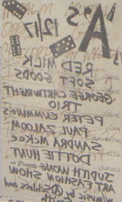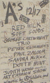 Now, I have something else to share with you that I think is pretty fucking amazing. I didn't actually realize how amazing until a couple of days ago. I'd found a picture in the Sensational Fix book that showed a display from the actual Sensational Fix exhibit, containing numerous "Early Sonic" artifacts such as the Noise Fest cassette and memorabilia, Arcadians gig posters, etc. Something I hadn't seen elsewhere was a poster for the 12/17/80 gig at A's where Thurston and Kim's new project made its (supposedly disastrous) debut. There was some debate in the narrative as to whether they'd played this show as MALE BONDING or RED MILK, and the poster left no question: they bombed as RED MILK.