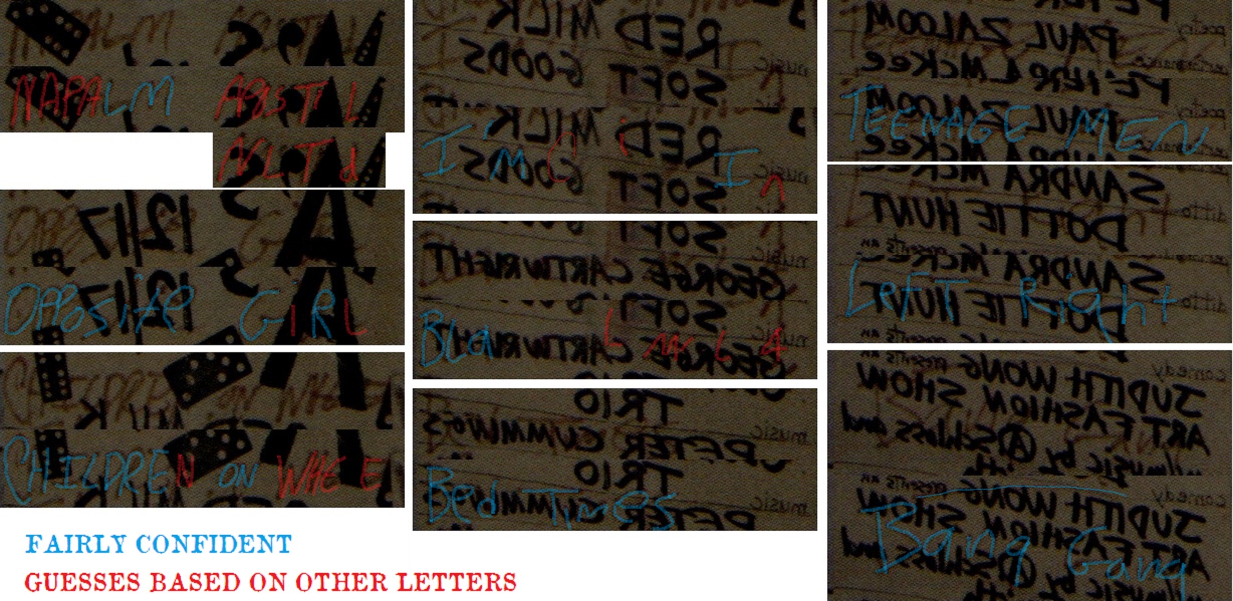 Okay, great! I cropped it out as best I could, and saved it to a folder with a few other things I'd found since launching the "early sonic" feature, figuring I'd add them when I had enough to justify an update. I was checking out some of the articles Chris had sent me, and happened to look at the thumbnail for the A's poster. Something jumped out at me...was there writing on the back of the poster? I flipped the image and yeah, I know a set list when I see one. I could make out some words but nothing seemed too familiar, until the two words that confirmed what I had found: "TEENAGE MEN". That was one of the few confirmed Red Milk songs, so it seemed to be Red Milk's set list. Other visible titles that I'm confident I've deciphered correctly are "Left Right" and "Bang Gang". I think one is "Bed Times", one could be "Opposite Girl", one is "Children on _____" and there's a couple that seem damaged by a stain. Regardless, it's thrilling to imagine all of these unheard songs (and also wonder if any are the Noise Fest mystery tunes). You can read more below and check out my attempt to trace the letters in each word - I would love to hear any other opinions on what these titles might say!