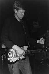 In the Confusion is Next bio, it specifies that they only played two shows with Jim Sclavunos (which I think will prove to be just slightly off), one of which was at the Kitchen. Jim pops up in a few of the Sonic Death liner photos, and while I was trying to identify the various venues seen in those pix, I realized that one of Thurston and Kim was from the Kitchen. That strongly suggested that the other pic of Lee and Jim could be from the same gig. Later, Catherine Ceresole's Beauty Lies in the Eye book confirmed my suspicions, and also offered some new pix! In the new pic, Thurston is clearly playing "The Burning Spear". Lee probably is too. In the Sonic Death pix...brace yourself for a whole new can of worms...introducing the Drifter.