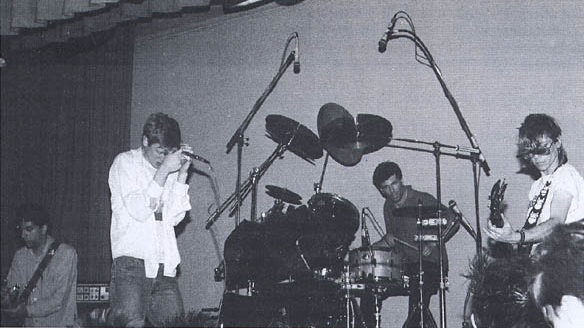 ![]() Since the interview jumps from the first album to Edson leaving and the Swans tour, I wanted to address a few notable shows during his tenure. Sonic Youth played the opening weekend of Danceteria on February 6th, 1982. I'm almost positive this picture from the Sonic Death liners is from that show, since they painted the green pillar a darker colour shortly thereafter. In this picture you can clearly see the black bass Kim is playing, as well as the rack of bells that Lee kept at the side of the stage (he would bang them during "The Burning Spear"). In Sonic Life, Thurston says they found the hanging chimes in the street, and later lost them after a gig at the Pyramid when they forgot to load them into the van and left them in the street where they found them. This may have been the October 27th, 1984 gig. You can see a duct taped drumstick peering out from Thurston's guitar, which is confirmed by another picture taken within moments, published on SY's instagram. Also, Edson has ditched the bongos for a roto-tom. Progress? Based on Kim's hand position and Thurston singing with a drumstick under his strings but not in his hand, I'm pretty sure they're playing "She Is Not Alone". Another note about those early Sonic Youth tunes - the person singing did not play while they sang, with very few exceptions.
