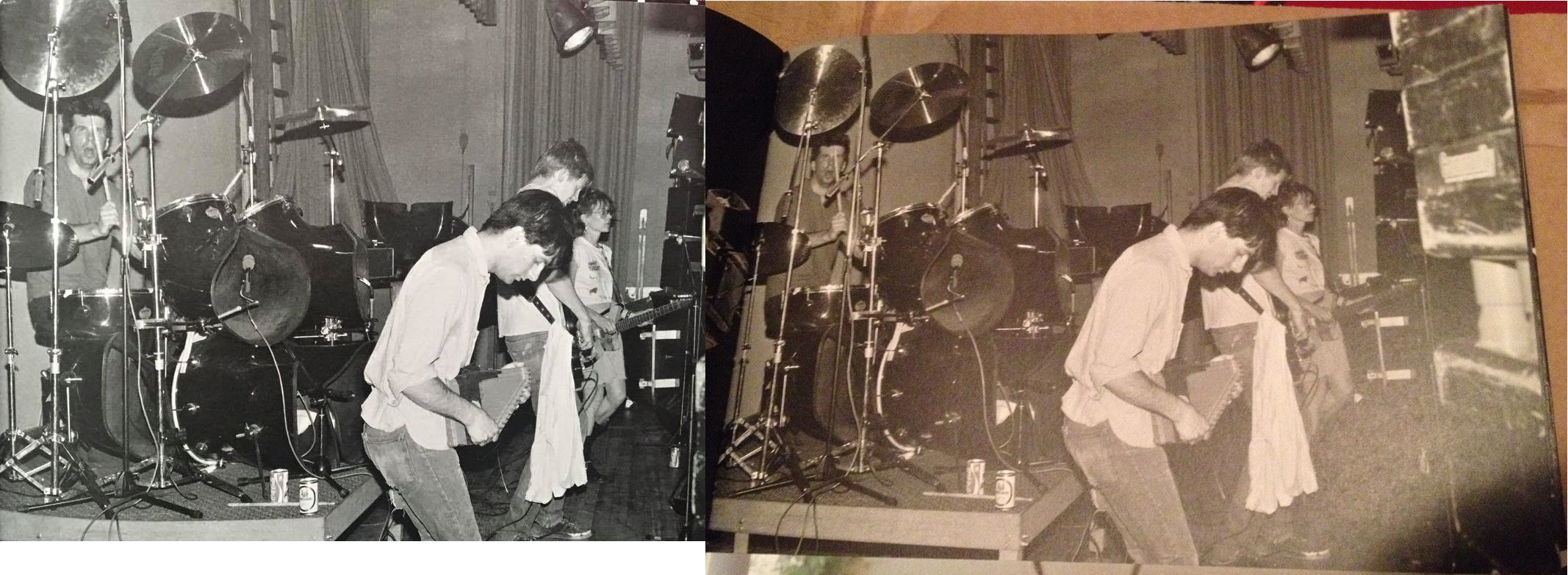 ![]() There's even some photos from the Milan gig! I don't have too many pics from this tour, one from Groningen and one from Amsterdam. There's also a nice set of pictures from November 1st, which you can check out over here. There was some previous confusion over the November 1st date, which was often labelled Linz, Austria @ Posthof, but is really from Hof, Germany. It would seem they actually played Linz on the 11th, but at Stadtwerkstatt, not Posthof (which did not open until 1984). This leaves only the question of which show the circulating recording belongs to, and I'd have to guess Linz, since it was labelled as such, and begins with "The World Looks Red" while the Hof pictures heavily display "Early American", likely the opener of that show. I did stumble across another exciting set of photos (with thanks to Raj Paden!), taken by Petra Gall at the Berlin gig on October 30th. She took a whole roll throughout the show, which can be viewed here, though only four photos are offered in full sized quality. I took the effort to isolate and magnify every other picture she took, and you can track much of the set, from "Early American" to "Burning Spear" to "Confusion is Next" to "Bad Mood" to "Brother James" to "Nature Scene", based off the instruments used. Unfortunately the legendary London gig does not circulate, but Thurston's comment that they came out and did "Kill Yr Idols" and his guitar broke in his hands makes me think this is when the Gherson SG fell apart, and while it's listed on the "INSTRUMENTS USED" sheet for the Bad Moon Rising material in 1984, I don't actually know that it was. It was, however, used for "Skrewer Boy", Thurston's contribution to the Tellus #10: All Guitars compilation. Its whammy bar made a particularly delicious squeak when it spun, which he captured extensively, likely after the guitar had been otherwise disabled.