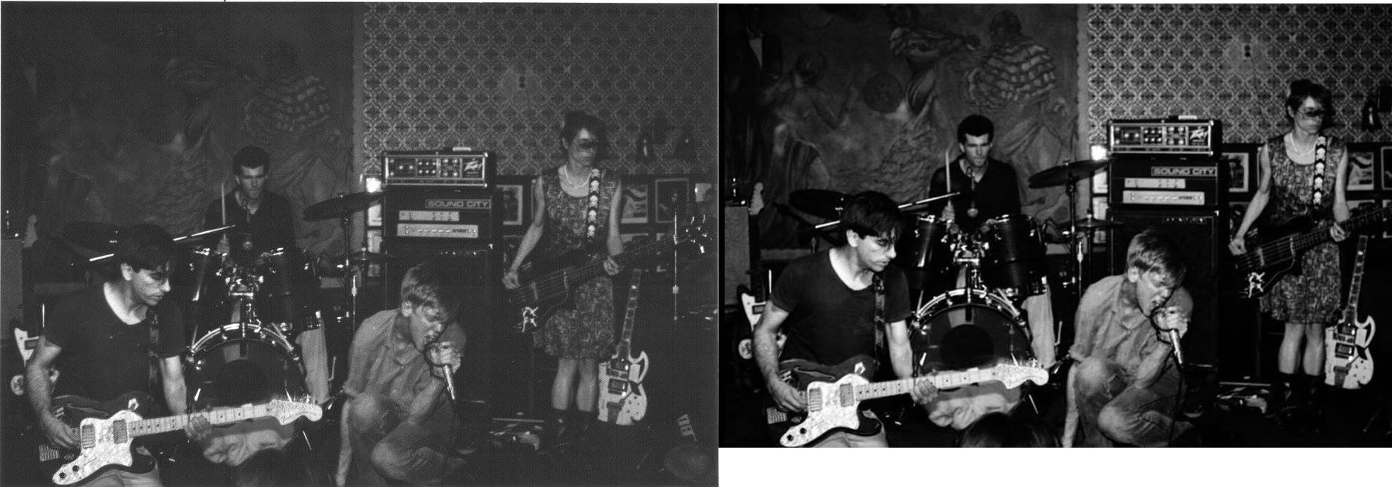 | This is one of the most interesting segments in Sonic Death. It's a slow, detuned guitar riff punctuated by cymbal crashes and a two-note sliding bass riff. It sounds like the same concept being played over and over with some direction, not an aimless improvisation, but who knows. Part of me wonders if this could be "Blooze Blurrr", or at the very least explain that Sin Club pic where Thurston is playing the Knox, Kim is playing a high bass note, and Lee is on the mic. Obviously Lee isn't heard singing on this track, but it could be a smaller portion of a longer piece (it never falls apart, just cuts). The open guitar notes DO sound like Thurston's detuned Knox "anything" tuning, and Kim does seem to be hitting a note way up high on the low E. Pretty far reach, but maybe not the farthest so far. | ||||