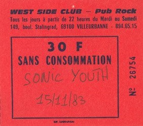 ![]() groningen The November 24th Groningen gig is the source of "Shaking Hell" on the disc that came with the Sonic Life biography. It's also the source of "Kill Yr Idols" and part of "Confusion is Next" on side 2 of Sonic Death. In fact, I've been able to determine several other parts from this tour that were used on Sonic Death - a minute and a half of the long thundering chords that would often precede "The World Looks Red" are preserved from the Munich gig (as is one second of the song itself). Side 2 begins with "Early American" and part of "The Burning Spear", taken from the beginning of the November 4th Zurich show. I've ruled out every other show I have, but there's obviously a ton of recordings that aren't circulating. That leaves the mysterious Bad Mood, a double 7" bootleg that features five songs from 1983 ("live in Sweden" per the sleeve). I've determined that all five songs are taken from the November 3rd Biel, Switzerland show. Sweden, Switzerland...whatever. Also, five songs from October 30th in Berlin were released on a bootleg CD called The Social Power Performance. Another track that might be from this Berlin show is "Audience", released in 2002 on the Anthology of Noise and Electronic Music compilation. It's a 6-minute piece - but you can go ahead and speed it up by 50% to hear it at its true speed - and is basically what the title suggests, the crowd very loud and rowdy and demanding an encore. Since the June show has no encore, I assume it comes from October. Unfortunately, there's a big splice in the recording between the band leaving the stage and returning for "The World Looks Red" so I can't be 100% sure. The other element is that the band supposedly turned the microphones towards the audience and began feeding the sound back to them, possibly modifying it somehow. How much was done on the fly and how much was "re-created at Echo Canyon, New York, in 2001", I really don't know. Though not official, perhaps the most exciting document from this entire tour is a video of the entire November 8th Milan, Italy show. It blew my mind when I first received a grainy, incomplete VHS copy in the 90s, and still thrills me to watch. After listening to the Venlo boot countless times, being able to watch a performance from earlier in the same tour was like a dream come true. It also reveals the current status of the Drifter, which had disappeared from pictures after those mystery cowbell pix. In Milan, it was Thurston's drumstick guitar for "The Burning Spear", having replaced the Harmony Bobkat which was in use on the June tour.