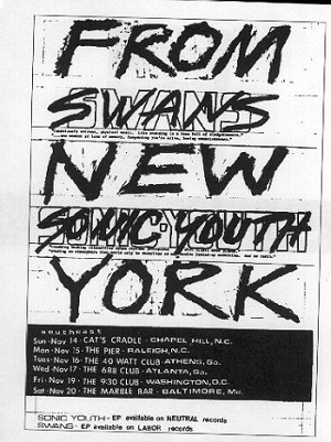 | This is taken from (presumably) the end of the November 15th, 1982 Raleigh show. Thurston can be heard addressing the crowd, resisting requests to hear more, suggesting a Sonic Youth/Swans jamfest instead. | ||||