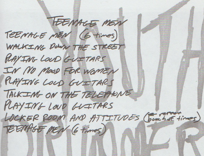 It's certainly pretty cool to see a gig poster for their first live performance, particularly to set the record straight regarding their name. However, I noticed that there was something on the back of the poster, so I flipped the image around and took a look. At first I wasn't sure I had anything useful, until the words "TEENAGE MEN" jumped out at me. And that's when I knew - I found a fucking Red Milk set list, presumably from this very gig. There appear to be nine songs in all, in Thurston's handwriting. Sure, it's not entirely legible, but I can make out at least two or three other titles in addition to "Teenage Men", including "Bed Times" "Left Right" and "Bang Gang", which was apparently the encore. Others may be "Opposite Girl" (not "Cosmopolitan"!) or "Children on something". Wheels? Who knows...I think the first song probably starts with "Napalm" though the diagonal stroke of the "N" would not match any of the other ones. Imbalm?! I've made a reference where I've outlined the letters I see, but I'm very open to ideas. What looks like a "W" might be an "N", etc. There may be a stain in the center of the page, obscuring songs four and five. None of these titles immediately connect with any of the four tunes later played at Noise Fest, but you never know. In Sonic Life, Thurston recalls that they only had four or five songs. This would seem to contradict that, though they may have cut the set short due to the issues on stage - all anyone could hear was drums, and nobody could follow what was going on. Fortunately, they didn't give up...they just changed their name.