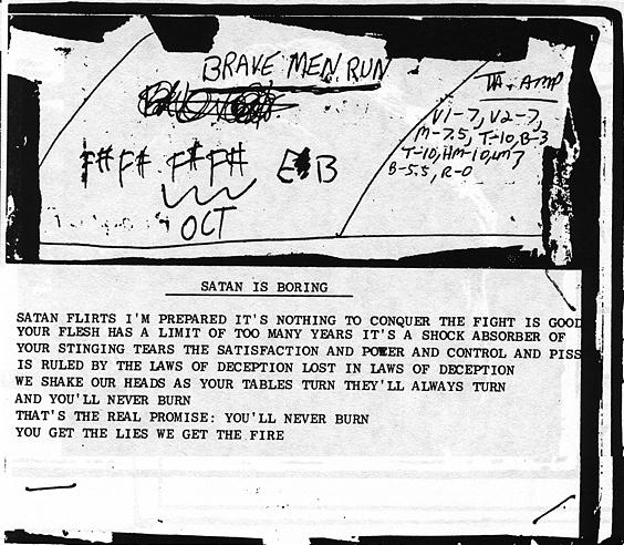 - Always a fun live tune when it popped up, generally based off Lee's tape loop and the rollicking drums. Thurston's lyrics often varied from the written lyrics, and the song would spiral off into superjam territory. Actually, on the April 1985 versions, Thurston would often sing the lyrics to "Green Light" very slowly instead of the actual 'Satan is Boring' words. This was before "Green Light" was a separate song.